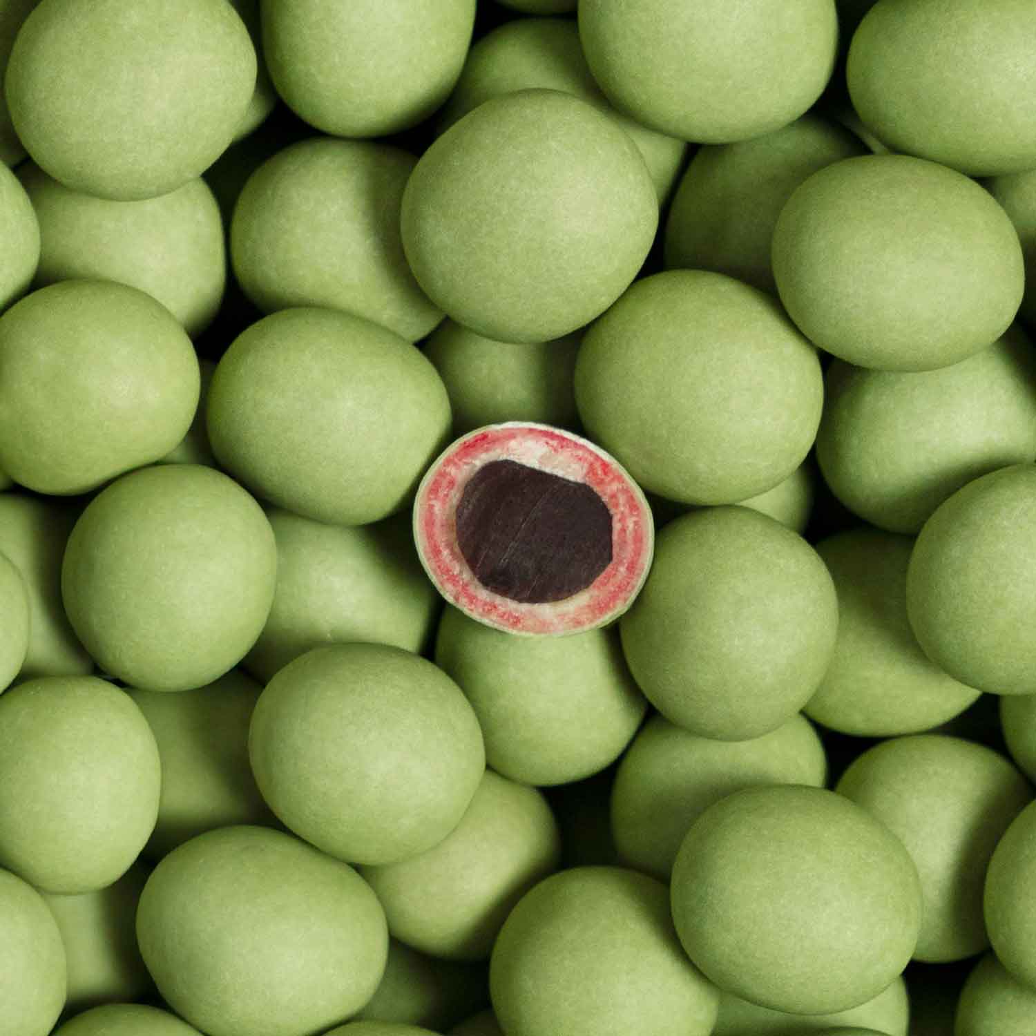 Enjoy how fresh and sour notes from crispy, green strawberries are perfectly balanced with chewy red liquorice, all swirled in silky white chocolate and a crunchy, green sugar shell for an extra sour twist.